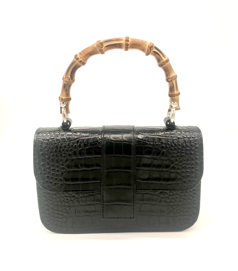 Borsa media in pelle di vitello  stampa Cocco  con maniglia in bamboo e tracolla removibile, tasca interna ed esterna.