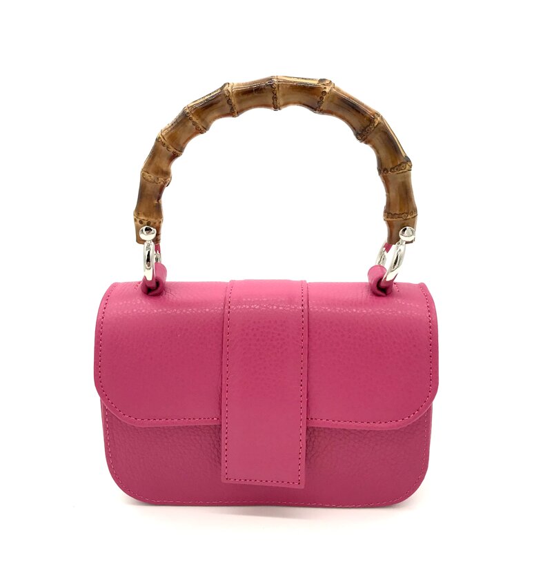 Borsa media in pelle di vitello con maniglia in bamboo e tracolla removibile, tasca interna ed esterna.