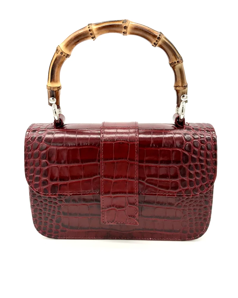 Borsa media in pelle di vitello stampa Cocco con maniglia in bamboo e tracolla removibile, tasca interna ed esterna.